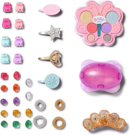 BABY born Sister Stylinghoofd Prinses met make-uppalet, haarborstel, 4 haarclips, 8 schuifspelden, 4 haarelastiekjes, een tiara en 14 siersteentjes.