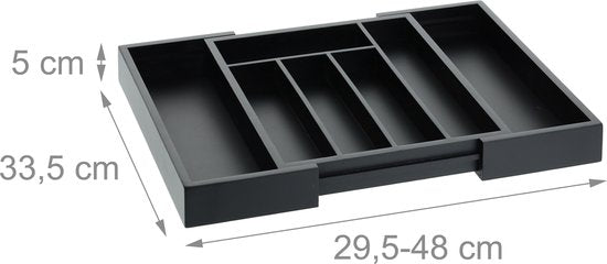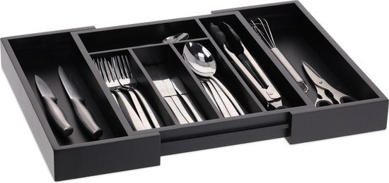Dankzij deze fantastische bestekbak behoren chaotische keukenlades voorgoed tot het verleden. De zwarte organizer heeft 5 normale en 2 uitschuifbare vakken en beschikt dus over voldoende ruimte om er bestek, keukenmessen en ander keukengerei in op te kunnen bergen. Je kunt de bestekcassette niet alleen gebruiken voor bestek, maar voor schrijfwaren, knutselspullen en andere spullen. En is hij vies? Geen probleem! De bestek organizer kun je namelijk snel afdoen met een doekje.