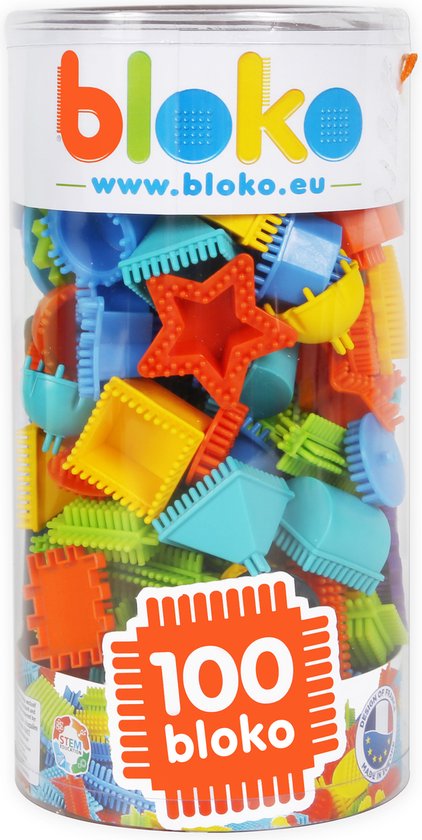 - Tube met 100 constructieblokken in verschillende vormen en kleuren waarmee je leuke creaties kan bouwen.