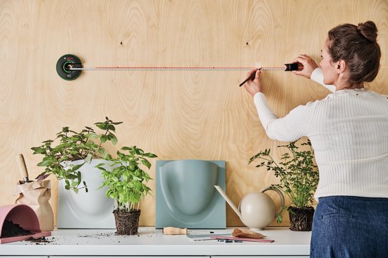 - Verwijderbare en vergrendelbare rolmaat voor het meten van afstanden tot 2 meter, voordat je aan de wand begint