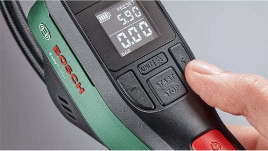 Bosch EasyPump accupomp; een klein gereedschap, grote prestatie. De EasyPump is de intuïtieve drukpomp van Bosch voor alle toepassingen tot max. 10,3 bar. De realtime meting van de pomp en de voorkeuzefunctie ondersteunen comfortabele en nauwkeurige resultaten bij het oppompen. De pomp heeft een duidelijke gebruikersinterface met een groot display dat bij daglicht afleesbaar is. Het compacte en lichte ontwerp zorgt ervoor dat de pomp ideaal kan worden meegenomen. Uitgerust met diverse adapters, die netjes in het opbergvak zijn opgeborgen, kan de EasyPump allerlei soorten banden (bijv. van auto, fiets), ballen (bijv. voetballen) en zelfs kleine watersportartikelen oppompen. Opblazen was nog nooit zo gemakkelijk.