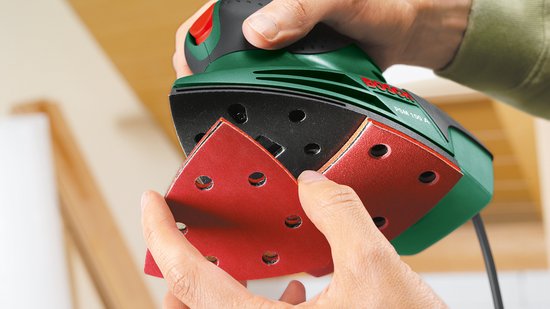 De Bosch PSM 100 A Multischuurmachine met veel talenten is de ideale keus om een groot aantal gewone schuurklussen met gemak aan te pakken. Hij is ontworpen voor moeiteloos werken in hoeken, langs randen en op kleinere platte oppervlakken. Schuurpapier wordt snel en gemakkelijk gewisseld door het klithechtsysteem. De Microfilter stofbox vermindert stof om de werkomgeving schoner te houden. Deze multischuurmachine is geschikt voor werken op houten (hardhout en zacht hout), gelakte en geverfde oppervlakken, en hiermee kunnen kleinere klussen zoals werken aan meubels, deuren, kozijnen, planken en houten speelgoed worden aangepakt.