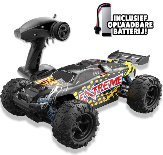De stevige 4x4 wielen en de met olie gevulde schokbrekers maken het mogelijk om robuuste off road actie’s te maken met deze Extreme Racer. Met de controller stuur je de race auto nauwkeurig alle kanten op. Voorzien van 4 kanalen met een frequentie van 2.4 GHZ.