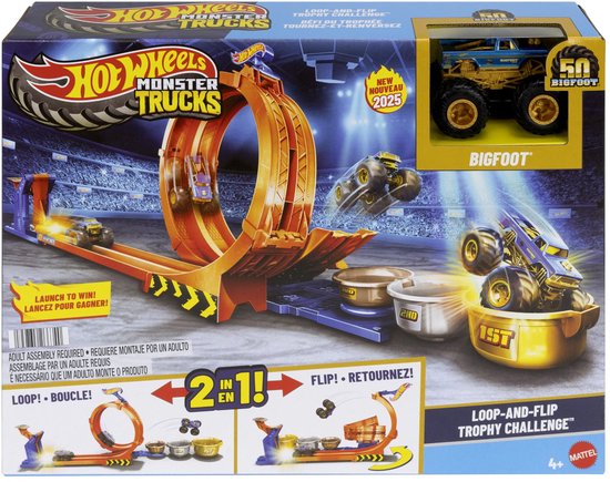 - Wat zit er in de doos: Inclusief 1 Hot Wheels Monster Trucks Loop-And-Flip Challenge en 1 gegoten Hot Wheels Monster Trucks 50e verjaardag Bigfoot