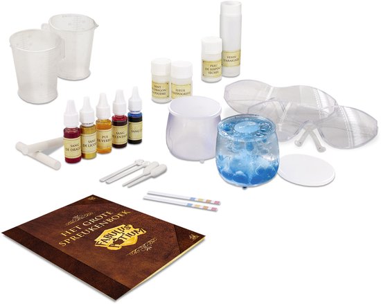 Twee tovenaars, elk met hun eigen ketel! De tovenaars moeten samenwerken om de formules in het magische spreukenboek te begrijpen, de ingrediënten te bereiden en de juiste mixen te maken om indrukwekkende drankjes te maken. Is het eenhoornbloed dat gemengd wordt met de gedroogde slangenhuid? Explosies, schuim, vloeistof en lavalampen zullen onder andere op de agenda van de tovenaars staan! Deze leuke experimenteerset is voor kinderen vanaf 8 jaar die interesse hebben in scheikundige proeven.