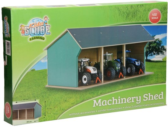 Parkeer je tractoren in deze grote landbouwloods van Kids Globe. De landbouwloods biedt plaats aan 3 landbouwmachines en is gemaakt van hoogwaardige kwaliteit hout. De landbouwloods is gemaakt op schaal 1:32 en wordt geleverd zonder accessoires. De loods dient zelf gemonteerd te worden.