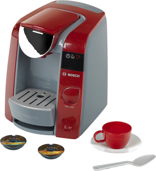 Het multifunctionele speelgoed-koffiezetapparaat met een geluidsfunctie op batterijen is kindvriendelijk. Het apparaat heeft een waterreservoir, laat het water circuleren, lijkt als twee druppels op het origineel, is gemaakt in Bosch-design en volkomen ongevaarlijk omdat er niets heet wordt. Als accessoires worden een espressoset en twee koffiepads meegeleverd.