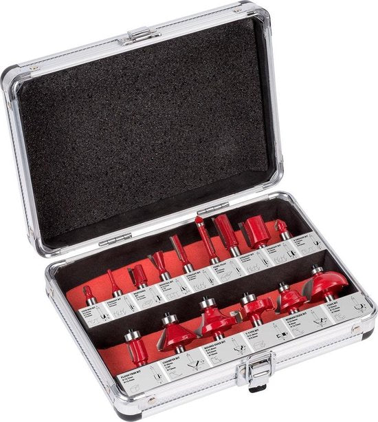 Deze aluminium koffer bevat een set van 15 verschillende frezen in premium DIY-kwaliteit voor een bovenfrees. Met deze set haal je alles in huis om de meest veelzijdige afwerkingsvormen te frezen in houtmaterialen met een professioneel resultaat. De frezenn in de set zijn geschikt voor alle freesmachines met een spantangdiameter van 8 mm.