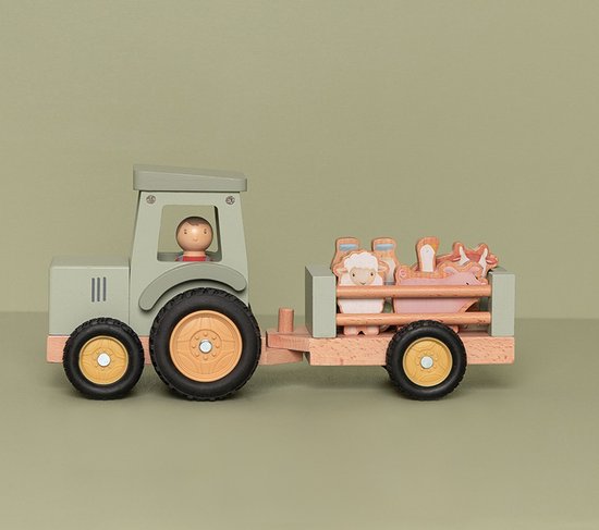 Help een dagje mee op de boerderij! In de Little Dutch Tractor Met Trailer Little Farm FSC neem je alles mee voor een geslaagde dag op de boerderij. In de trailer is ruimte voor dieren en twee melkflessen. Met de tractor en aanhanger rijd je zo je eigen fantasievolle speelwereld in. Gemaakt van FSC-gecertificeerd hout is het een stevige speelgoedset die lang meegaat.