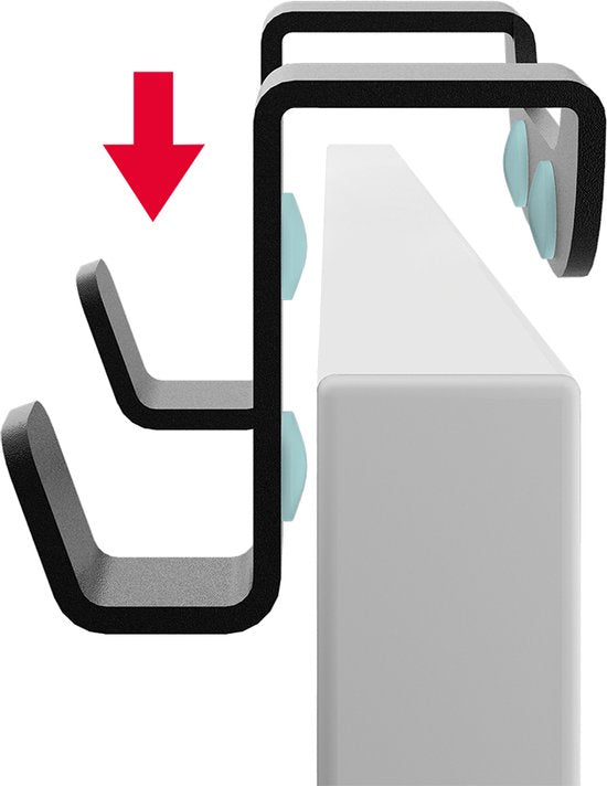 Deze handige dubbele haak uit de Galileo lijn is ideaal in de keuken. Je kunt het rek aan de binnen- of buitenkant van je keukenkast hangen en je spullen netjes ophangen. Het rek past over nagenoeg alle keukenkastje (2cm) en heeft een matzwarte kleur.
