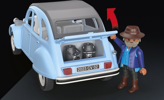 De speelgoedset bevat een Citroën 2CV van PLAYMOBIL, drie PLAYMOBIL-figuren, een varken, twee ganzen, twee melkkannen, koplampen en nog veel meer leuke extra's. Een perfect cadeau voor autoliefhebbers en nostalgiefans.