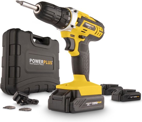 Deze 20V accu-schroefboormachine van Powerplus is een ideale allrounder. Je kan er zowel mee boren als vast- én losschroeven.