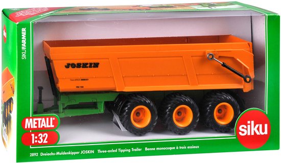 Massief model van de Joskin-kiepwagen met kantelbak Trans-Space in de grootste uitvoering. 3-assig chassis van metaal met grote en volumineuze luchtbanden met landbouwprofiel. De kantelbare bak met achterklep die open kan, is gemaakt van stevig kunststof.