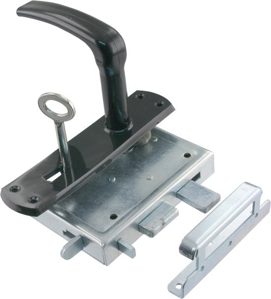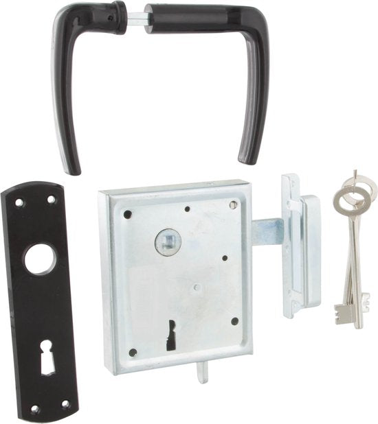 Het slot is eenvoudig te monteren en is geschikt voor zowel linksdraaiende als rechtsdraaiende deuren. Het is een luxe uitvoering, compleet met 1 paar krukken, in de kleur zwart waardoor uw poort een mooie uitstraling krijgt.